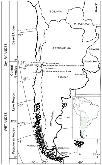 - Ruiz Pereira, S.; Veettil, B.K. Glacier decline in the Central Andes (33° S): Context and magnitude from satellite and historical data. J. South Am. Earth Sci. 2019, 94, 102249. [Google Scholar] [CrossRef]