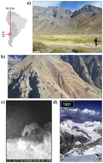 Intersected dimensions of landscape appraisal in Juncal Andino park, Central Andes of Argentina/Chile. (a) A RAMSAR site, (b) an aerial photograph of mining expansion within the viewshed at 33°S, (c) a Puma concolor image from trap cameras within the park, and (d) a 1951 photograph (aiming at north-east) of the Chile/Argentina border at 33°S taken by Eberhard Meier. Figure adapted from Ruiz Pereira, 2021 [57].
