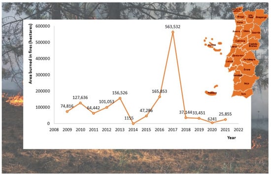 The area burned in Portugal by wildfires (in hectares) between 2008 and 2021. Adapted from [8].