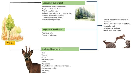 In this study, the authors aim to provide a brief, easy-to-read overview of the impact of wildfires and their main consequences on wildlife. Even though it is more focused on veterinarians, it also can serve as a guideline for all the entities involved in the prevention and combat of wildfires and the general public that has an essential role in these situations. In the first section of the review, the authors describe how the different species are expected to behave during a wildfire and the impacts on the ecosystem. Then, from a vet’s point of view, we list the major injuries that are expected to be observed and how to proceed. Finally, the authors discuss the best prevention measures and how responses to forest fires can be improved.