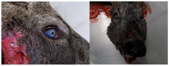 Ulceration of the eye due to high temperatures and partial thickness burns in the head of a roe deer (Capreolus capreolus) (Photo: Isabel Pires).