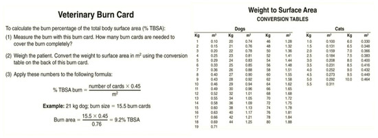 Several methods can be used to calculate the surface area burned in an animal body as a percentage of the total body surface area. One of the most straightforward methods is based on Wallace’s “rule of nine” used in humans, which divides the body into regions that are multiples of 9% of the total body surface area. In animals, the head and neck are counted as one “nine” or 9%, each forelimb 9%, each hind limb two “nines” or 18%, and the dorsal and ventral halves of the trunk 18% each (Figure 5). However, this method has limitations since there is significant variability between animal body shapes. For example, surface areas have not been determined for macropods due to the great diversity of tail lengths. Another method used is the “Resuscitation Burn Card,” which gives a more precise measure (Figure 6) [47,49].