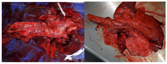 Terrestrial and aquatic are vulnerable to the inhalation of airborne toxins in the smoke (e.g., carbon monoxide (CO), hydrogen cyanide (HCN), and delicate particulate matter (PM)). A large number of animals die from smoke-induced asphyxiation [50]. Animals can suffer from carbon monoxide poisoning (mostly fatal), thermal and chemical burns in the respiratory tract, and short- and long-term respiratory diseases [47]. Furthermore, when the lungs are filled with smoke, animals cannot maintain their body temperature by evaporative cooling and can overheat [51]. Symptoms of smoke inhalation include dyspnea, tachypnoea, wheezing, polypnea, coughing, foaming at the nostrils, and tachycardia [52,53,54]. When thermal and chemical lesion occurs leads to fluid accumulation in the lungs (edema) [55] (Figure 7). Due to the low exchange of gases in the lungs, animals rapidly enter hypoxemia and acidosis [49]. Long-term exposure to wildfire smoke can alter or weaken the animal’s immune response. They became more vulnerable to respiratory infections (e.g., pneumonia) and chronic heart disease [49,56]. Wildfire smoke also can alter animal behavior (e.g., movement, vocalization), reduce growth rates and reproductive success [16].