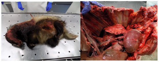 When animals try to escape the flames, they become disoriented, and sometimes they can suffer accidents, such as being run over by a car, falling in holes, or crashing against structures, such as walls or trees [9]. Animals can present soft tissue and skeletal injuries, mainly affecting the extremities (e.g., fractures, internal bleeding, bruises) (Figure 8). The severity of the injury must be assessed, and when it cannot be rehabilitated, the animal must be euthanized [9]. Some birds can suffer electrocution when trying to escape [61].