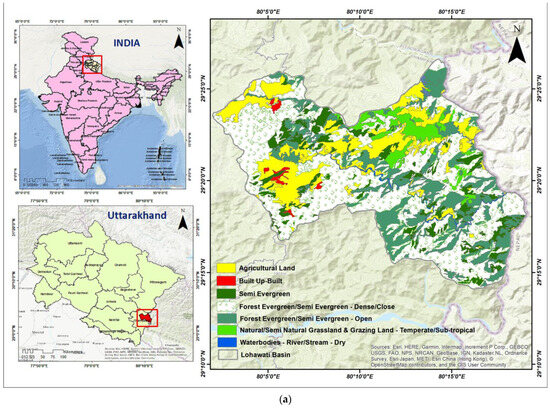 The study area spans from 29°26′30′′ N; 80°3′30′′ E to 29°15′30′′ N 80°20′0′′ E in the Kumaon district of eastern Uttarakhand, India (Figure 1a,b). The Lohawati, a major river that cuts across the basin, is responsible for the basin’s appellation. The river flows from Bansaur Kila in the west to the east for about 10 km before reaching Lohaghat. Valleys and hills are dotted over the exceedingly rugged environment all along its length. A prevalent evergreen forest particularly characterises the middle and lower sections of the basin. Agriculture is practiced irregularly in the basin’s upper section, i.e., near the source. Lohaghat, the largest settlement along the river’s edge, has the maximum inhabitation. The residents frequently perform religious rituals along the riverbanks, close to the city. Water for both human and agricultural use is drawn from the river. Many tributaries flow into the river at various spots. The water level in the river has been dropping for multiple reasons, including continuing water withdrawals for domestic and agricultural use, insufficient recharge from precipitation, and others. The river begins its long journey through the Himalayas, passing through picturesque valleys, narrow gorges, villages, and finally, the Indo-Nepal border at Tamli, where it joins the River Mahakali.
