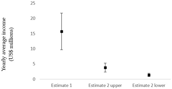 The total number of tourists arriving in Madagascar for the period 2007 to 2018 was nearly 3 million people with, on average, over 240,000 people arriving each year (Table 1). Of this number of tourists, it was estimated that the number of ecotourists visiting each year was nearly 41,000 (Table 1). Over the total period 2007–2018, ecotourism generated a total income of nearly USD 189 million using Estimate 1, nearly USD 46 million using the Estimate 2 upper value and nearly USD 17 million with the Estimate 2 lower value. On average, across the period 2007–2018, a yearly income was reported ranging from a low of USD 1.4 million up to a high of USD 15.7 million (Figure 1).