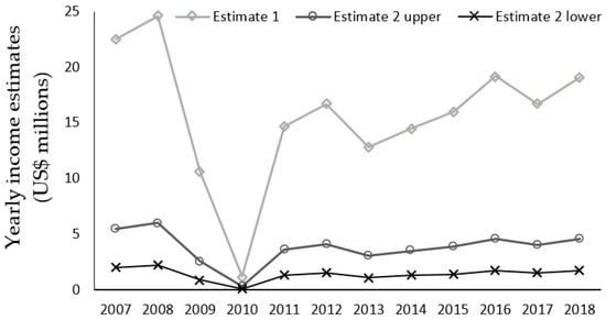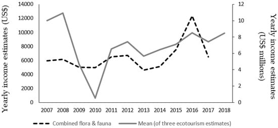 The highest level of income in any one year from ecotourists was in 2008 when it generated USD 24.6 million, while the lowest was in 2010 when USD 0.1 million was generated (Figure 2). Over 2007–2018, a linear regression analysis found no increase in ecotourism growth over the period (y = 0.0741x + 15.235; R2 = 0.002) for Estimate 1. However, any long-term trend would be masked by the significant decrease in 2010. Applying a linear regression to a subset of the data, after the crash from 2011 to 2018, the income generated from ecotourism using Estimate 1 was generally increasing (y = 0.613x + 13.454; R2 = 0.4556) back towards the high recorded in 2008 (Figure 2).