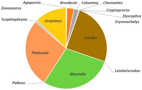 Each of the animal genera with species and numbers reported within the import data (two genera, Eupleres and Fossa, were reported in the import data set but with no data reported) exported from Madagascar between 2007 and 2018. It should be noted that Chamaeleo are not found in Madagascar and the reporting here is an artifact of data reporting within the CITES data set (Reprinted by permission of Princeton University Press).