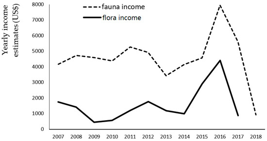Consequently, using species-specific prices that were extracted from published scientific literature and adjusted for varying yearly levels of inflation, the calculation revealed an estimated total of USD 72,300 being generated from the trade between 2007 and 2018, and potentially made available to local communities (Table 4). The animal grouping contributed the majority (USD 54,728, nearly 76%) to the total value, with the plant grouping contributing USD 17,572 (over 24%). In the year 2016, both the animal and plant groupings recorded the highest levels of income (animals = USD 7944; plants = USD 4416), but both decreased rapidly post-2016. Trade remained static until 2013 (animals) and 2014 (plants), after which both groupings increased rapidly in the levels of trade (Figure 5).