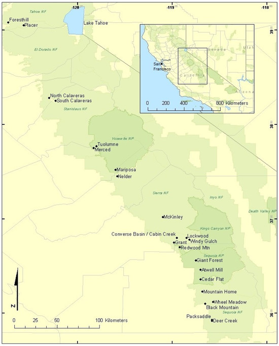 - York, R.A.; Stephenson, N.L.; Meyer, M.; Hanna, S.; Moody, T.; Carrio, T.; Battles, J.J. Giant Sequoia. In A Natural Resource Condition Assessment for Sequoia and Kings Canyon National Parks; Sydoriak, C., Panek, J.A., Battles, J.J., Nydick, K.R., Eds.; Natural Resource Report NPS/SEKI/NRR-2013/665.11a; National Park Service: Fort Collins, CO, USA, 2013; 81p. [Google Scholar]