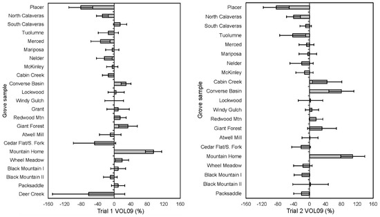 Trial 1 (pure planting; left) and trial 2 (mixture; right) giant sequoia steckling grove sample mean stem volume (VOL09) in percent above or below the steckling mean after 29 growing seasons at Foresthill Seed Orchard as of 2009. Among-grove differences were statistically significant (p ≤ 0.1) in a Kruskal–Wallis one-way ANOVA at alpha = 0.1. Placer and Deer Creek grove samples were not included in the analysis. Error bars are relative standard errors of the grove sample mean, where the grove sample standard error is divided by the mean and expressed as a percent (%). Grove samples are arranged from north to south in the figure. Some groves are not represented in mixed planting (Trial 2).