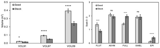 Trial 1 seedling (Seed; n = 68) and steckling (Steck; n = 63) conic stem volume in three measurement years over 29 growing seasons (left) and form traits assessed in 2009 after 29 growing seasons (right) at Foresthill Seed Orchard. Form traits assessed on a four-point scale (0 = weaker; 3 = stronger). Only grove samples with both seedlings and stecklings planted in trial 1 were included in this analysis. Tests of significance were conducted using the nonparametric Kruskal–Wallis test. Levels of significance for each growth period are indicated by asterisks (ns = no significance; * p < 0.05; ** p <0.01; *** p < 0.001; and **** p < 0.0001).