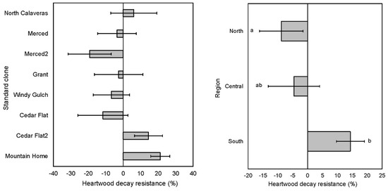 In the analysis of the heartwood decay resistance of standard-clone stumps thinned in 1999, the region of clone origin in the native range was a significant explanatory variable (p ≤ 0.05) (Figure 4). Heartwood decay resistance was greatest in the thinned stumps of standard clones with origins in the south region of the native range, which were significantly different from north-region stumps in a multiple comparison test (p ≤ 0.05) (Figure 4). The mean DBH of standard clones in 1997 two years before thinning was included in the analysis to account for the effect of size differences in the cut stumps on heartwood decay resistance. The covariate for DBH97 was not significant (p = 0.39) in this analysis.