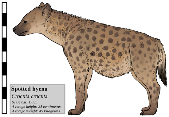 Fully grown spotted hyenas are about a meter tall and weigh up to 70 kg (Figure 1). They have heavy forequarters and a strong large heart to facilitate long distance travel and endurance. Spotted hyenas can cover forty kilometers in a single night in pursuit of prey. Unlike striped hyenas, spotted hyenas are apex predators that compete directly with lions. They can take down wild ungulates at speed and can hunt up to 95% of their own prey. Coupled with this, they are highly adaptable and quick to supplement their diets by scavenging. Their jaws are strong, and their stomachs hold concentrated hydrochloric acid, allowing them to eat and digest a wide range of animal products including meat, skin, bones, and waste. Generally, spotted hyenas live for 12–18 years, though some live for up to 25 years.