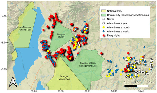 While carrying out participant observation in the villages surrounding Manyara Ranch (Oltukai, Esilalei, Makuyuni, Olasiti, Mswakini Chini, Mswakini Juu, and Naitolia), I was alarmed by the frequency of spotted hyena attacks on kraaled livestock at people’s bomas—hyenas seemed to attack livestock every night. During discussions with herders, people lamented that hyenas were an everyday concern. To assess the representativeness of these personal observations and conversations, I asked survey respondents across the study villages to estimate the frequency of hyena visits to their bomas and the frequency of livestock attacks. More than half of the survey respondents (54%; n = 584) felt that hyenas visited their boma on a nightly basis. This result made clear the scale of the issue: the majority of households across the study area had become accustomed to nightly hyena attacks. Mapping these perceptions through GIS software revealed an uneven spatial distribution of conflict hotspots, with homesteads around Manyara Ranch reporting the most frequent attacks (Figure 3).