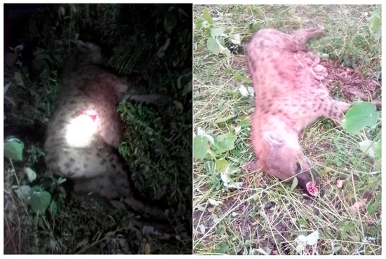 Human–carnivore coexistence is a two-way street, and pastoralists often affect carnivore conservation outcomes through retaliatory killings. Since spotted hyenas mainly attack sheep/goats, and Kisongo Maasai do not value small stock as much as large stock, some researchers have suggested that hyenas seem to be less affected than other large carnivores by retaliatory killings [43,85,86]. While lions kill far fewer livestock than hyenas, Kissui (2008) documented that they are disproportionately persecuted by herders in retaliation, perhaps because they target grazing cattle more than hyenas do [85]. Another explanation seems to be that hyenas do not actively defend their kills as lions do, and are quick to flee and get out of range of spears and arrows [86]. Since most hyena depredation events occur at night, it is also often more challenging for people to kill hyenas given reduced visibility and the elusiveness of the attacks. Maasai do occasionally poison a carcass to leave out for hyenas [85], and it is worth noting that my ethnographic observations over the study period made clear that people do kill hyenas regularly to defend their stock (Figure 4). They do not, however, generally track down hyenas in response to depredation events in the same way that they do for lions, likely because lion kills generate more social capital for young warriors.