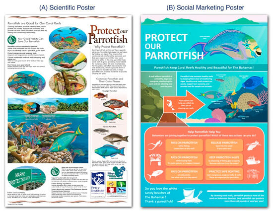 Experiment 1 tested differences in reactions to posters that promote wildlife conservation using scientific and social marketing messages. Two posters were made in collaboration with wildlife conservation organizations for use in communities in The Bahamas to impact parrotfish conservation behaviors. The collaborators developed two different pieces of content to compare: a detailed scientific poster and a visually engaging social marketing poster (Figure 1).