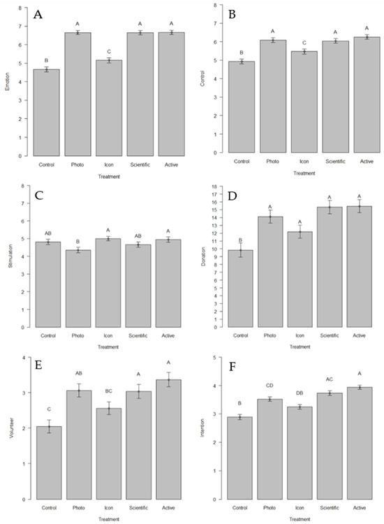 Reactions to the five posters: Control: No image and no text; Photo: Scientific image of a photograph (no text); Icon: Image with behavior icons (no text); Scientific: Scientific poster; and Active: Social marketing poster. Results are labeled in significantly different groupings. The same or shared letters indicate no significant difference among the corresponding groups. Differing letters indicate significant differences among groups. The y-axis of each graph represents the mean and standard errors for the following: (A) Emotional reactions; (B) sense of control and capacity to act; (C) the intensity of reactions; (D) willingness to donate funds to parrotfish conservation; (E) willingness to volunteer for the cause; (F) willingness to change their behavior to help parrotfish.