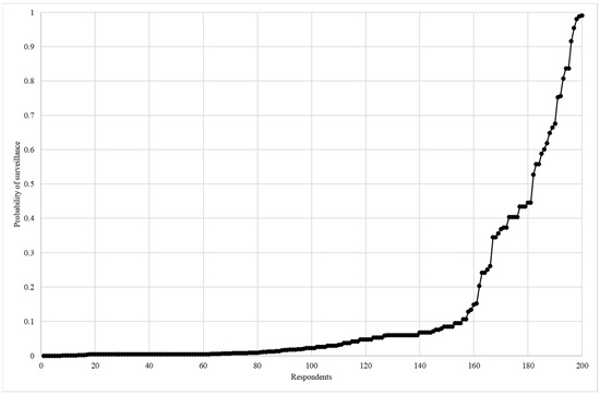 Probability distribution for surveillance by respondents (ants). Notes: The probabilities of engaging in surveillance were estimated using the coefficient estimates from the logistic equation associated with column 5 in Table 6. The predicted probabilities were then ordered from lowest to highest to facilitate interpretation.