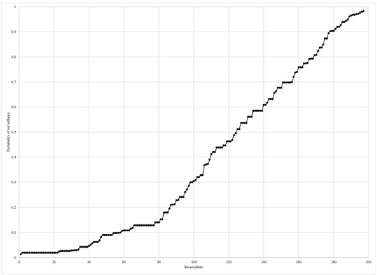 Probability distribution for surveillance by respondents (turtles). Notes: Probabilities of engaging in surveillance were estimated using the coefficient estimates from the logistic equation associated with column 5 in Table 4. The predicted probabilities were then ordered from lowest to highest to facilitate interpretation.
