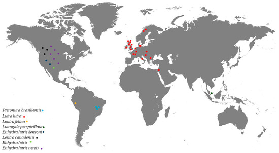 There are 13 recognised species of otters belonging to the subfamily Lutrinae within the family Mustelidae [7]. These species are distributed across various aquatic habitats worldwide, from freshwater rivers and lakes to coastal and marine environments. The Eurasian otter (Lutra lutra) is found across Europe, Asia, and North Africa. The North American River otter (Lontra canadensis) lives in North America. The Neotropical otter (Lontra longicaudis) is distributed throughout Central and South America. The Southern River otter (Lontra provocax) is found in Chile and Argentina. The Marine otter (Lontra felina) lives along the west coast of South America. The Giant otter (Pteronura brasiliensis) inhabits South America’s Amazon, Orinoco, and La Plata river systems. The Smooth-coated otter (Lutrogale perspicillata) is found in the Indian subcontinent and Southeast Asia [8]. The Asian Small-clawed otter (Aonyx cinereus), the smallest otter species, is distributed in South and Southeast Asia. The African Clawless otter (Aonyx capensis) is found throughout much of sub-Saharan Africa. The Congo Clawless otter (Aonyx congicus) inhabits the Congo basin. The Hairy-nosed otter (Lutra sumatrana) is found in Southeast Asia and the Sea otter (Enhydra lutris) occupies the northern and eastern North Pacific Ocean and the spotted-necked otter (Hydrictis maculicollis) is in freshwater habitats across sub-Saharan Africa [8].