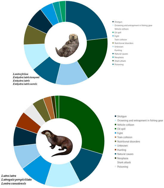 Across all species, traumatic events are a major cause of death, with a significant proportion linked to human actions, such as collisions with vehicles, fishing gear entanglement, shotgun wounds, poisoning, and oil spills. Natural factors, including infectious diseases and cancer, along with poorly understood causes, also contribute to mortality rates. The available literature reinforces that over half of otter deaths can be attributed to trauma, highlighting the considerable effect of human activities on these populations [19,48,49].