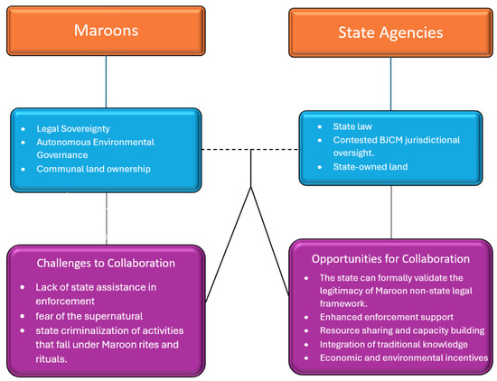Consequently, there emerges a call for an evolved form of legal pluralism, wherein (1) the state expressly validates the legitimacy of the Maroon non-state legal framework and (2) commits to aiding in the enforcement of Maroon legal directives upon request. This appeal gains further pertinence against the backdrop of the state’s formal recognition of Maroon heritage for tourism-related economic benefits, which accrue to both Maroons and the state alike. A deliberate choice by the state to recognize and materially endorse Maroon legal authority, rooted in Maroon heritage, promises to yield mutual environmental and economic dividends. Such formal recognition could lay the groundwork for initiating dialogues with Maroon communities, aimed at reconciling shared interests and divergences in environmental governance perspectives. The potential for collaboration between Maroon communities and the state represents a pivotal opportunity to foster participatory decision making in the development and application of environmental regulations. While the feasibility of such a partnership is apparent, its realization is fraught with challenges. Historically, Maroons have harbored a deep-seated mistrust towards state entities, a sentiment rooted in their enduring struggle for land rights and legal independence. Similarly, state representatives, such as Park Rangers, exhibit apprehensions regarding Maroon intentions. As reflected in Figure 6, despite these hurdles, a dialogue centered around shared objectives and the mutual benefits of legal pluralism could yield significant advantages for both parties.