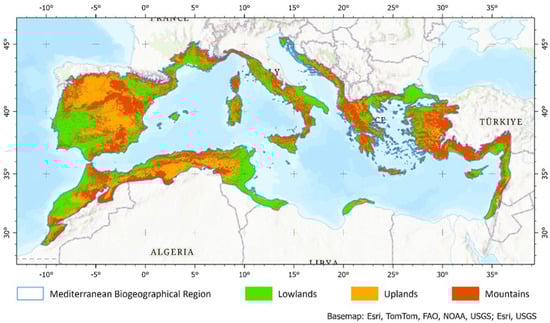 Mediterranean Biogeographical Region limits. Green areas correspond to lowlands (territories up to 500 m, with slopes up to 15%), orange areas correspond to uplands (territories between 500 and 1000 m, with slopes up to 15%), and red areas correspond to mountains (all territories with slopes higher than 15%). Sources: The delimitation of the Mediterranean area coincides with sub-biome 5a and Oceanic scleropyllous–microphyllous evergreen forests and shrublands (Mediterranean), defined by [7] and Habitats Directive (92/43/EEC) and for the EMERALD Network set up under the Convention on the Conservation of European Wildlife and Natural Habitats (Bern Convention) [8]. The elevation/slope categories were based on Aster Global Digital Elevation Map [9].