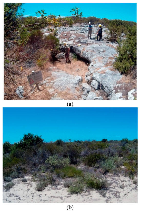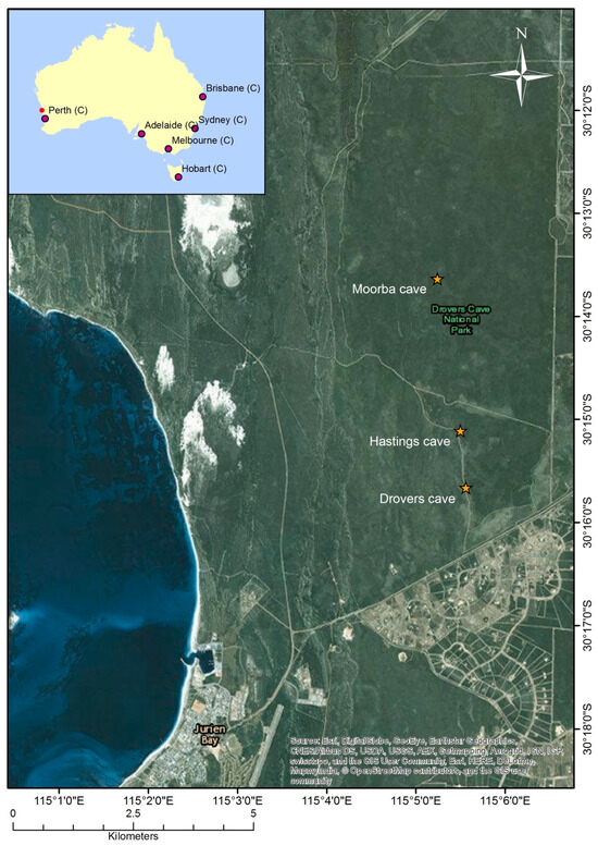Drovers Cave National Park is located on the mid-west coast of Australia (Reserve No. 31302, 30°14′ S 115°5′ E; Figure 1). It covers an area of 2681 hectares of complex geological features [39,40] and broad extensions of sandplain. The native flora is highly diverse and composed mainly of proteaceous shrublands and woodlands [41,42] (Figure 2). This national park includes a series of limestone karst caves, with Drovers Cave being one of the larger at approximately 150 m long and 15 m deep, and with three chambers [36].