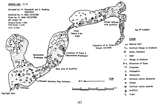 (a) Main entrance to Drovers Cave; (b) sandplain plant community of the area composed mainly of proteaceous shrublands on sandy soils; (c) internal map of Drovers Cave (reproduced from Webb [36]).