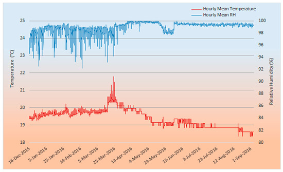 Hourly mean temperature (°C; red line) and relative humidity (%RH; blue line) from 13 iButtons placed in Drovers Cave from 16 December 2015 to 4 September 2016 (n = 2208). The timeline is divided into weekly periods.