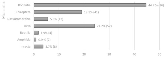 It was not always possible to classify all dried material to the species level, so we calculated the relative abundance of prey to the next most appropriate, higher taxonomic level. We conservatively estimated the number of whole individuals from each taxonomic class present in the dried material samples (n = 215). Only mammals were divided into three orders: rodents, dasyurids, and bats. To avoid re-counting the same individuals, we considered only the largest number of a particular prey item from one specific taxon coming from the same location. For example, when analyzing birds collected from the first collection site, we counted either pairs of wing bones or legs, depending on which had the larger sample size. We calculated the minimum number of prey individuals in our samples by dividing the dried material according to the anatomy of the prey species. For instance, we divided by two the total number of insect elytra, feet, or wings of birds and bats. The total number of limbs of frogs, reptiles, dasyurids, and rodents were divided by four. Dis-articulated tails were not included in the data analysis, although they were numerous, since many were broken and we could not determine which fragments were part of the same tail. Detailed information on the full diet range identified from visual examination and subsequent metabarcoding examination are provided elsewhere [45,46].
