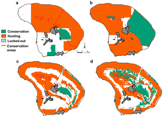 The Hawaiian Island of Lānaʻi with spatial prioritization footprints showing the conservation zone for meeting threatened and endangered species targets, and the hunting zone for meeting hunting targets, under four different scenarios: (a) boundary constraints; (b) boundary and lock-in constraints; (c) no boundary penalties; and (d) 95% native vegetation target included in the conservation zone and no boundary penalties. The planned conservation is the large area outlined in red on the eastern portion of the island. Zone targets were met across all scenarios.