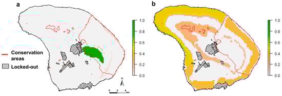 The Hawaiian Island of Lānaʻi with a replacement index for a scenario with threatened and endangered species and hunting targets and no lock-in or boundary constraints. The replacement scale indicates how important or irreplaceable an area is to meeting recovery targets on a scale from 0–1. (a) represents the conservation zone, and (b) represents the hunting zone.