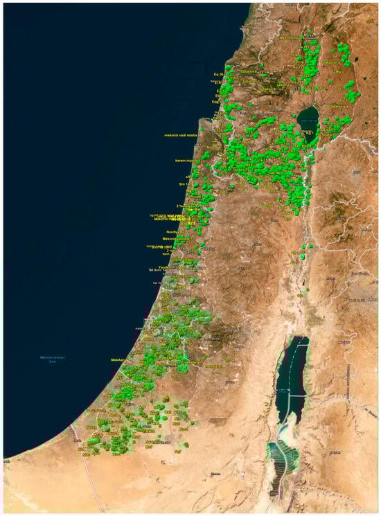 Map of installed Barn Owl nest boxes (>5000) in 2024 in the national territory of Israel. Each nest box is indicated with a green rectangular spot.