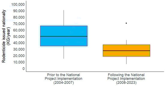 Boxplots indicating the annual amounts in kgs of 1080 rodenticides used in the national agricultural territory of Israel. The blue box plot demonstrates annual rodenticide use from 2004 to 2007. The orange box plot indicates annual rodenticide volume use from 2008 to 2023—after starting the Barn Owl project (source: Ministry of Agriculture of Israel, Dr. Yoav Motro).