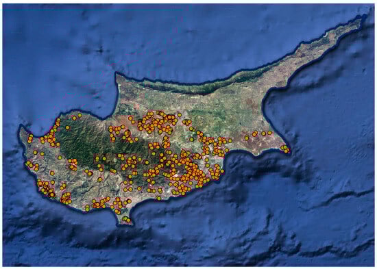 Map of installed and mapped Barn Owl nest boxes in 2024 in the national territory of Cyprus. The map includes a total of 738 gps-recorded and mapped Barn Owl nest boxes; the remaining 590 nest box localities will be mapped in the forthcoming period. Each nest box is indicated with a yellow dot.