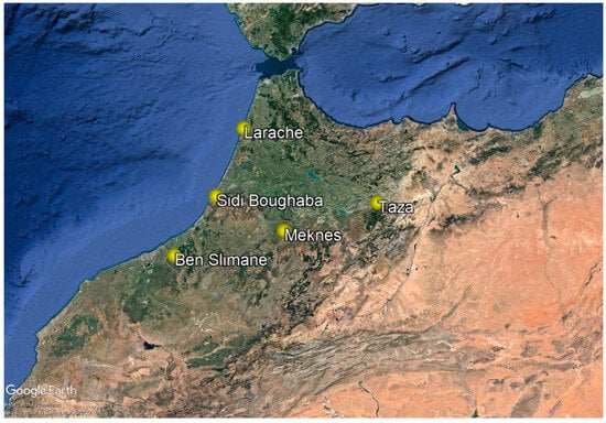 Map of discrete geographical regions in Morocco where the Barn Owl nest boxes are installed. Larache, Sidi Boughaba, Taza, Meknes, Ben Slimane.