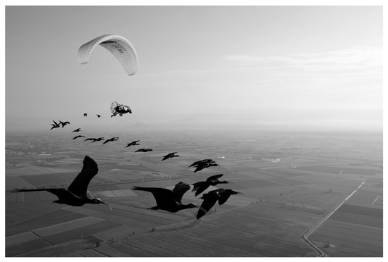 The project’s innovative use of human-led migration, where microlight aircraft guide hand-raised ibises to their wintering grounds, has proven to be a highly effective method for the establishment of new migratory patterns. In 1988, Bill Lishman became the first man ever to use a microlight plane to fly with a group of human-imprinted Canada Geese (Branta canadensis) [24]. In the frame of a 12-year feasibility study, the method was adopted for the Northern Bald Ibis, with several challenges to overcome. In contrast to geese, this species is altricial, which shortens the period of training until the onset of migration. Its active flight speed is relatively slow at about 45 km/h, which poses a technical challenge. And the species practises different flight techniques during migration, formation flight, thermal soaring/gliding and intermittent flight [18,26,51,52,53] and thus requires experienced pilots to adapt to the variable flight behaviour of these birds.