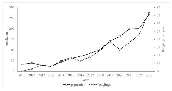 Since 2011, a steadily increasing number of wild-living birds are migrating between the wintering site in Tuscany and four breeding areas: Kuchl (country of Salzburg, AUT; 47.633790°, 13.160413°), Burghausen (Bavaria, GER; 48.156356°, 12.825322°), Ueberlingen (Baden-Wuerttemberg, GER; 47.780569°, 9.128938°) and Rosegg (Carinthia, AUT; 46.585935°, 14.021097°). Since 2011, birds have bred successfully in the wild. So far, 324 birds fledged in the wild (2011–2023), with 74 fledglings in 2023 (Figure 3). Detailed demographic data have been available since 2014. Since then, the survival rate from hatching to fledging has reached 86 ± 5 percent (2014–2023). The fecundity increased significantly from 1.60 fledglings per nest in 2012 to 2.96 fledglings per nest in 2023 (Linear Regression, R2 = 0.4446, p = 0.0179). In comparison, according to published demographic data [14], the fecundity in a sedentary Northern Bald Ibis population, established in Andalusia by Proyecto Eremita, increased slightly from 1.00 fledglings per nest in the early phases of the project (2008) to 1.28 fledglings per nest in 2020 (Linear Regression, R2 = 0.4033, p = 0.0265; Figure 4).