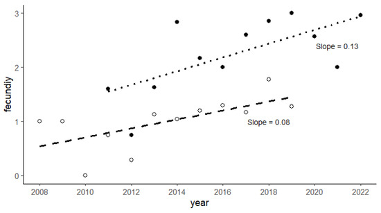 Fecundity of the migratory Northern Bald Ibis population as annual mean of fledglings per nest (black dots) with the regression line (dotted; slope 0.13). For comparison, the fecundity of the sedentary Northern Bald Ibis population, established in Andalusia by Proyecto Eremita, with the annual mean of fledglings per nest (white dots) and the regression line (dashed; slope 0.08).
