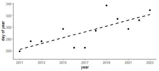 Shift of the autumn migration from the years 2011 to 2023. The diagram shows the respective day of the year when the first group of Northern Bald Ibises of the breeding colonies in Burghausen in Bavaria, Germany, and Kuchl in the country of Salzburg, Austria, crossed the Alps during autumn migration.
