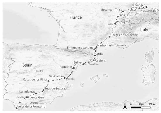 Route of the human-led migration from Baden-Württemberg to Andalusia in 2023; a route of 2300 km was covered with 19 flight stages.