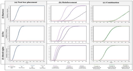 The effect of management strategies on SMBNP greater glider probability of extinction over 1000 iterations using Vortex10. The probability of extinction, modelled over three levels of catastrophe—(1) heatwave, (2) fire, and (3) altered regime—and three management categories: (a) nest box placement, (b) reinforcement, or (c) a combination of both.