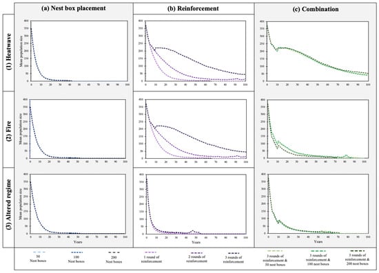 For both heatwave (1) and fire (2), nest box placement (management strategy a) did not change the population trajectory (Figure 3). The most influential factor with regard to mean time until extinction was reinforcement (management strategy b). This management category prolonged population existence between 10 and 56 and 5–26 years, respectively (Figure 2 and Figure 3). Population trajectory increased as levels of reinforcement were added to the model. Three rounds of reinforcement yielded the longest mean time until extinction. The use of a combined approach (management strategy c) had minimal effect on population trajectory, showing <1 year difference in mean time until extinction, than three rounds of reinforcement by itself. Within an altered regime (3), nest box placement (a) improved the mean time until extinction by 4 years (Figure 2 and Figure 3). Reinforcement prolonged the population’s existence by between 1 and 10 years. Three rounds of reinforcement yielded the best results.