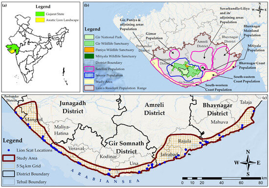 The Saurashtra region of Gujarat, located in western India, lies within the semi-arid biogeographic zone and the Gujarat-Rajputana province [26]. Gujarat is home to India’s longest coastline, stretching approximately 1600 km, and is known for its rich coastal biodiversity [27]. The coastal region supporting Asiatic lions span across the districts of Bhavnagar, Amreli, Gir-Somnath, Junagadh, and Porbandar (Figure 1).