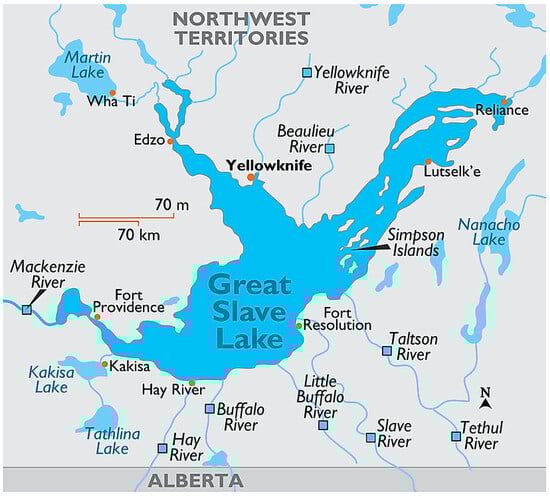 Canada is widely known for its vast waterways and aquatic species diversity. Home to some of the world’s largest freshwater lakes and three coastal zones, ocean and freshwater fisheries have long been an important source of food, livelihoods, and culture for Indigenous and settler communities across the country. Northern fisheries have sustained such communities for centuries and continue to hold significant cultural relevance, contributing to sustainable livelihoods across the region. While Indigenous communities fish for subsistence purposes in freshwater lakes across the NWT, a regional commercial fishery has existed since the 1940s on Great Slave Lake (GSL), covering 27,200 km2 [] (see Figure 1). This fishery has long been a source of livelihood for fishers and fish workers throughout the region, many of whom are proud of its reputation as one of the last remaining sources of unpolluted freshwater fish.