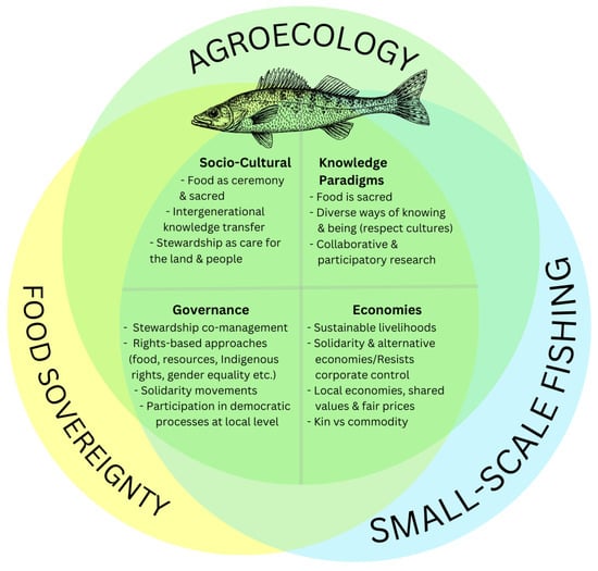 The inclusion of small-scale and Indigenous fishers in the global movement for agroecology is evident in policy reports co-written by national and international advocacy groups, including one following a World Forum of Fisher Peoples knowledge exchange in Indonesia in 2016 []. These constitute global networks of knowledge exchange where the pillars of food sovereignty have been applied to fisheries and harnessed in campaigns and organising struggles []. In 2015 the FAO published the ‘Voluntary Guidelines for Securing Sustainable Small-Scale Fisheries in the Context of Poverty Eradication and Food Security’ []. These set out principles and guidelines for upholding human rights through, for example, States’ duties to include a diversity of fisher voices in participatory policy processes while respecting small-scale fisher knowledge and marginalised groups, including Indigenous peoples. These FAO Guidelines are the result of years of advocacy and co-development by 4000 fishers and fish workers from 120 countries, and are considered a key tool in achieving several Sustainable Development Goals []. Figure 2 displays overlapping features of the FAO Guidelines, agroecology, and food sovereignty frameworks.