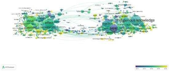 To accomplish the aim, this study conducted a search on the Web of Science database using the keywords “communal-based approach” and “bush encroachment” as indicated in previous studies [,]. The search revealed that the notion of a communal-based approach to addressing bush encroachment is not adequately understood or represented. Specifically, a comprehensive literature search yielded almost 16,000 papers related to “bush encroachment management”, but just 30 articles were found on the topic of communal-based approaches to bush encroachment. It is important to note that, within the Web of Sciences database, the 30 publications were the maximum number of articles associated therewith. This situation is worrisome, particularly in Sub-Saharan Africa, where the expansion of bushes is a significant difficulty, especially in rural areas. However, the methods employed by rural populations to address this issue have not been well recorded or accounted for. Therefore, this research intends to emphasise and bring attention to this existing deficiency. The investigation of bush encroachment management was conducted using the specialised programme VOSViewer. Afterwards, a graphic overlay depicting the research efforts related to managing bush encroachment was created, as seen in Figure 1.