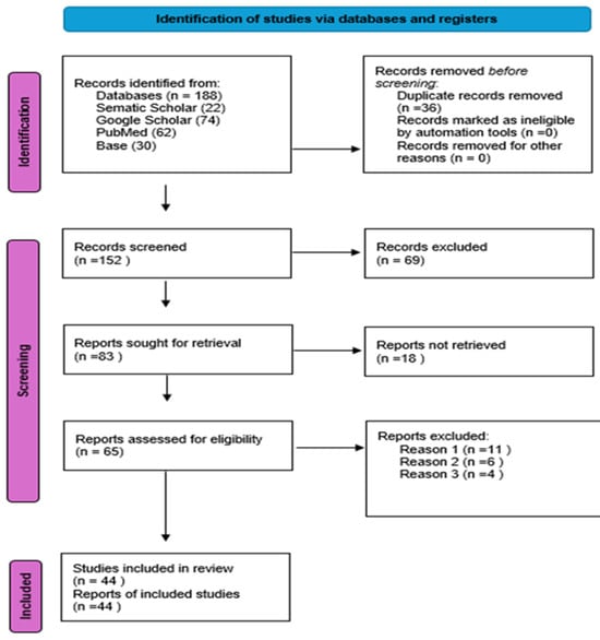 The authors chose to employ four separate databases, namely Semantic Scholar (22), Google Scholar (74), PubMed (62), and Base (30). The criteria for selection included the following: (1) the assessment of bush encroachment in rangelands (savannah); (2) methods for the monitoring and assessment of bush encroachment; (3) communal-based approaches to bush encroachment management in savannah areas; (4) the impact of bush encroachment on communal savannah rangelands; (5) common strategies and techniques that have been employed to manage bush encroachment; and (6) the relevance of bush encroachment in South Africa, Ethiopia, Namibia, and the Kingdom of Swaziland. Despite containing the keywords in their titles and/or abstracts, all studies focusing on bush encroachment in protected areas were excluded during the screening process because they were irrelevant to the study and lacked relevant data. The relevance verification in this review was carried out by three writers who reviewed the titles and abstracts. Two authors of this review performed relevance checking, which consisted of reading the titles and abstracts; disagreements were resolved by consulting the third author for accuracy checking. After removing studies that were not relevant, two reviewers collected data from the studies that met the inclusion criteria. By utilising the worldwide databases, the writers successfully identified possibly relevant entries. As shown in Figure 2, a dataset was identified, and the database search resulted in 188 items. As a consequence, 21 reviews were excluded from the analysis due to their failure to fulfil the predetermined eligibility criteria (shown in Figure 2). A total of eleven (11) records were excluded from the analysis due to their antiquated nature and insufficient coverage of savannah rangeland, which predominantly consists of grassland. Another justification for excluding an additional six articles was their exclusive focus on GIS, remote sensing, and modelling, without any consideration of community engagement. Furthermore, four papers were excluded due to their emphasis on wildlife management and national parks, which fell beyond the purview of the current study. However, 18 studies were excluded because the full papers could not be obtained given that they were not open access and the authors of those papers were not responding to emails; moreover, the papers were not available on ResearchGate. The authors obtained and evaluated the complete reports of publications that were considered eligible for inclusion by the authors. A total of 83 studies were found and evaluated for eligibility. In the present study, a total of 65 publications were selected for inclusion in the analysis. Subsequently, the whole texts of the remaining 65 reviews were meticulously scrutinised.